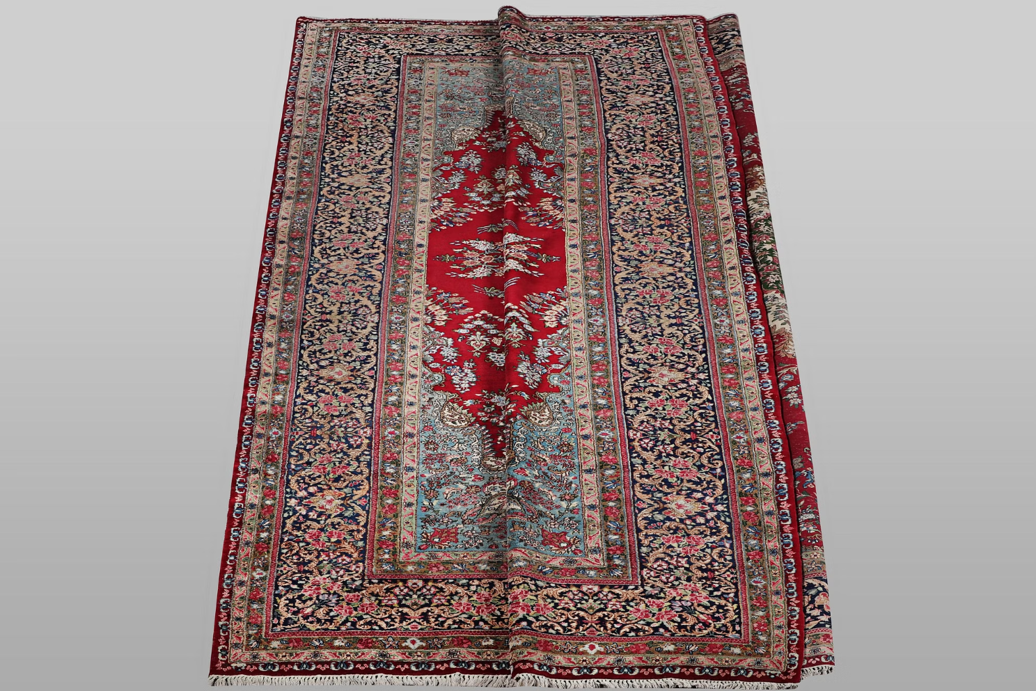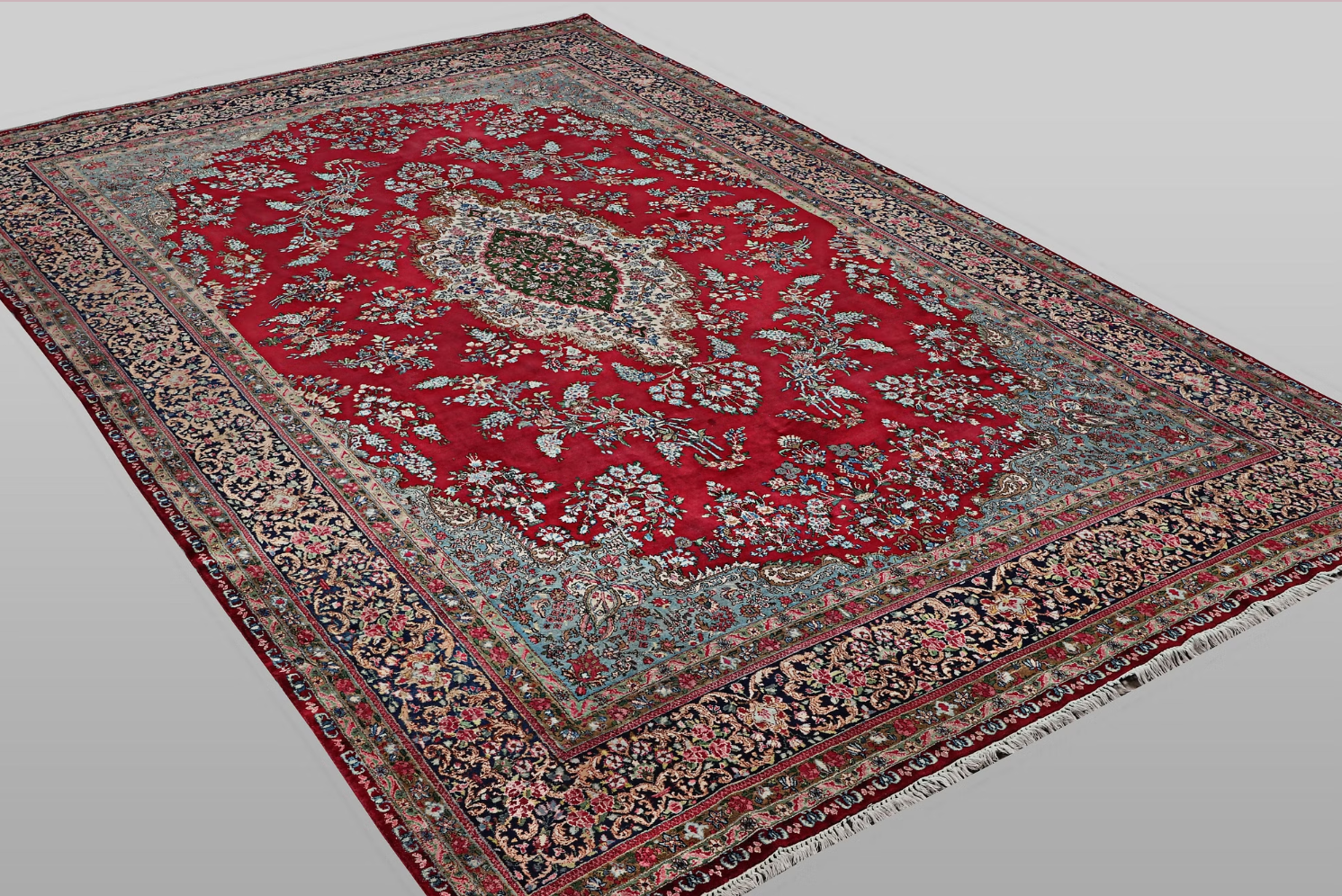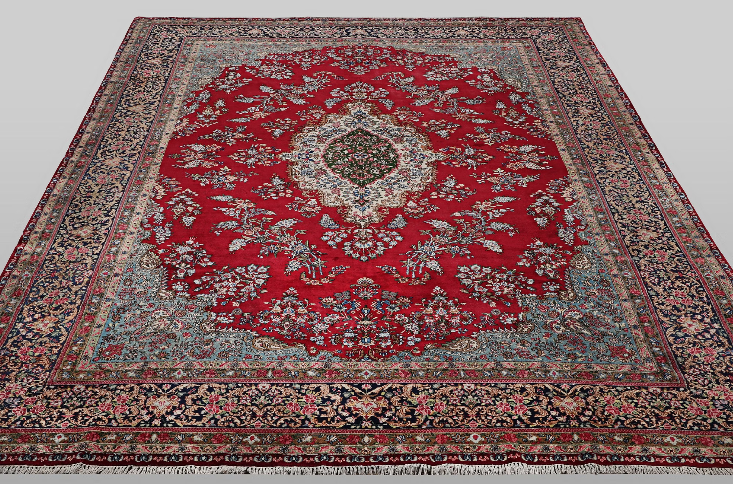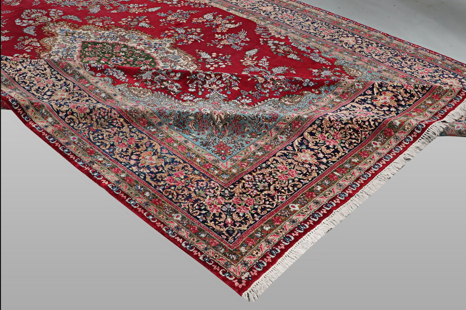 center lies a medallion in shades of green and ivory on a deep red field, surrounded by fine floral
