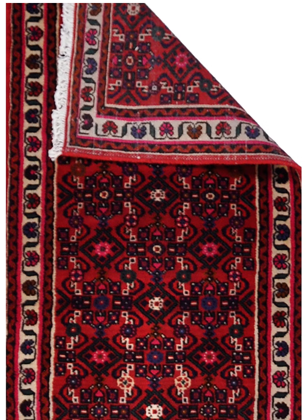 Hand-knotted Persian runner from the Hosseinabad region of Iran, woven with durable hand-spun wool. Characterized by its deep red field and repeating geometric floral motifs, it reflects traditional village craftsmanship and offers warmth and cultural depth to refined interiors.
