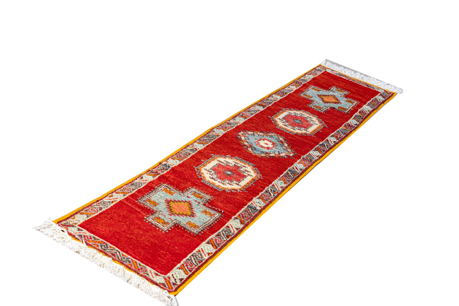 This authentic Persian runner features a luminous deep-red field adorned with a sequence of symbolic tribal medallions, articulated in soft sky-blue, terracotta, and ivory tones. Hand-knotted by skilled village artisans, it expresses the raw geometric rhythm of Hosseinabad weaving tradition while preserving remarkable durability. A refined statement piece for elegant entryways, corridors, or traditional–luxury interiors that value cultural depth and visual richness.